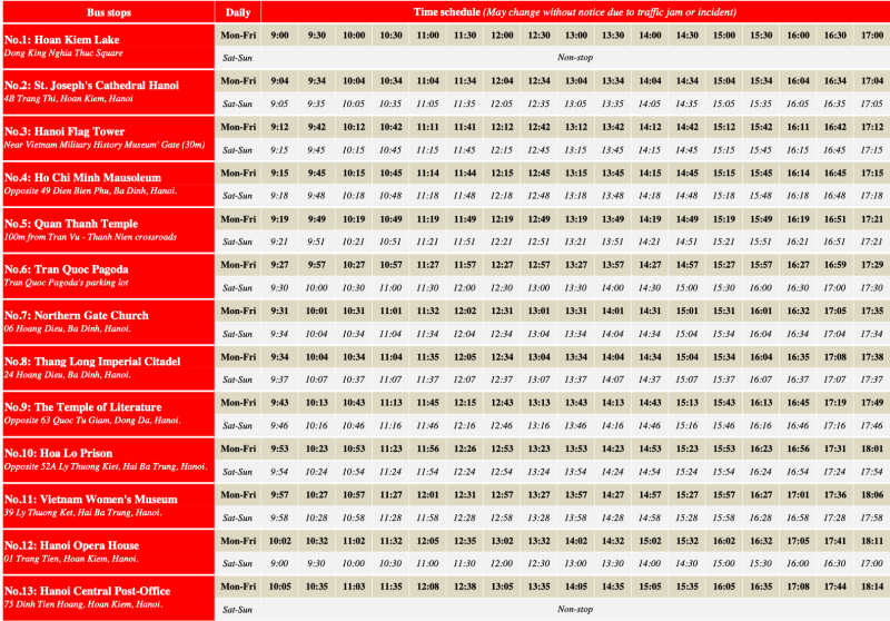 | Trạm dừng | Trạm dừng đầu tiên/ Điểm  bắt đầu hành trình Thứ 2- Thứ 6: Quảng trường Đông Kinh Nghĩa Thục (Số 1 Đinh Tien Hoàn) Thứ 7- Chủ nhật: Nhà hát lớn Hà Nội (Số 1 Tràng Tiền)Xe chạy theo các khung giờ là 9h00 – 10h45 – 14h30 – 16h15.Vé có giá trị trong 24h tính từ lúc lên xe. | ||||||||||||