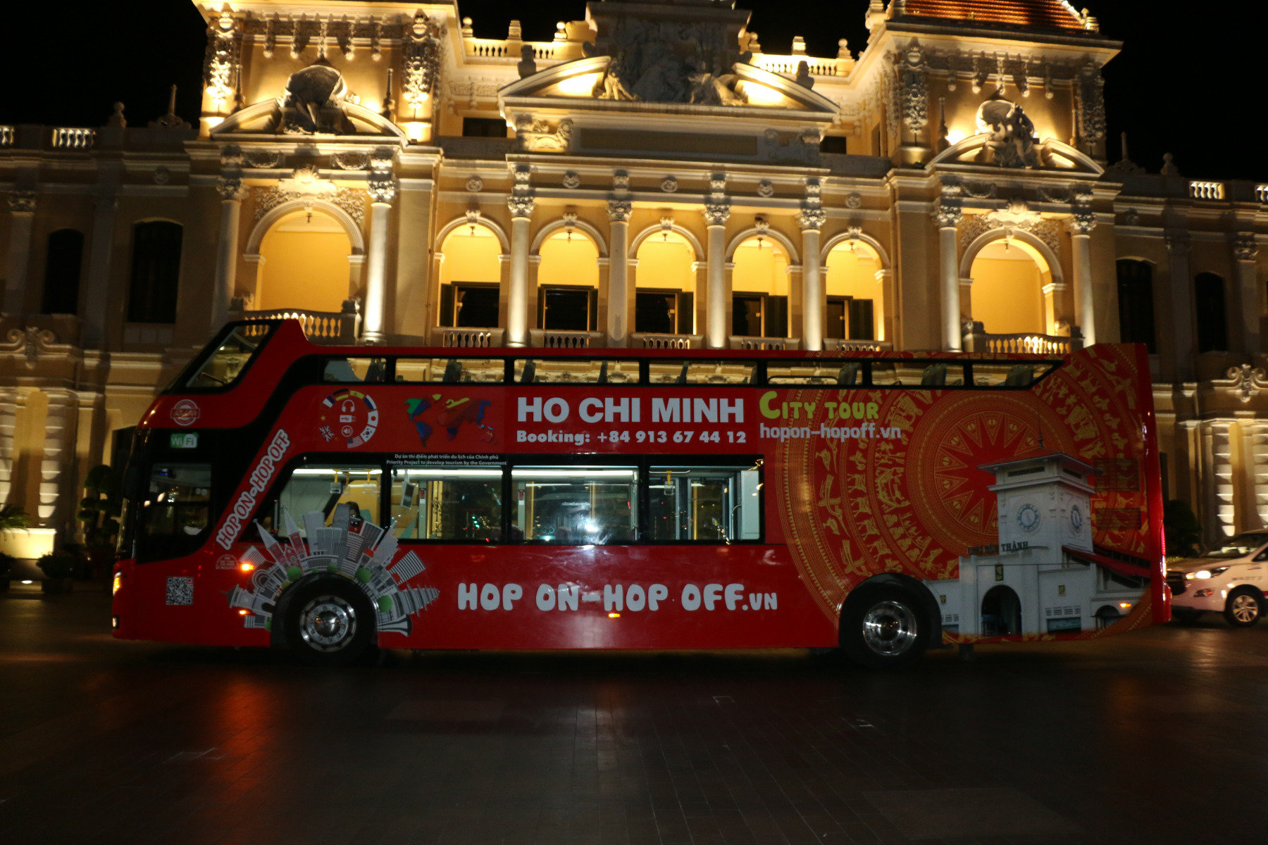 - The bus will go around the city without stopping, going through 20 top attractions such as The City Hall, The Opera House, Ben Thanh Market, War Remnants Museum, Independence Palace, City Central Post Office, Notre Dame Cathedral, Ba Son Bridge, Western Area – Bui Vien Walking Street, Nguyen Hue Walking Street, Saigon River – Bach Dang Pier, Bitexco financial Tower…