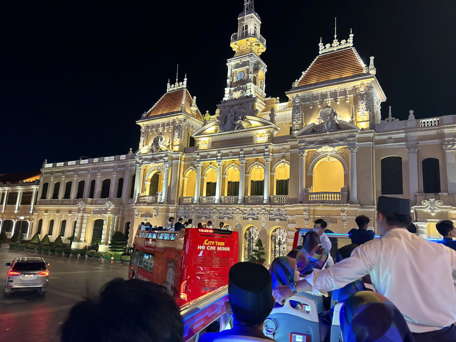 Discover Ho Chi Minh City after sunset on an open-top bus, enjoying illuminated landmarks, vibrant streets, and a relaxed panoramic night sightseeing experience.